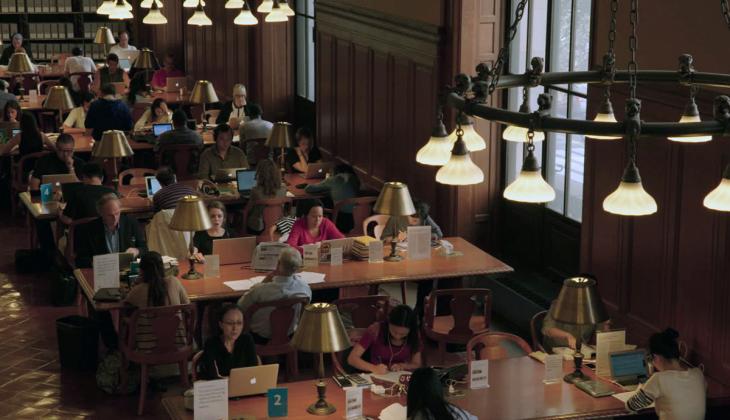 Frederick Wiseman’s documentary provides welcome confirmation of the survival of intelligent life in discouraging times. Ex Libris demonstrates the dedication of the New York Public Library, with eighty-eight branches spread across five boroughs, to support and reflect the vibrant diversity of the city at its best. Observing board meetings, celebrity speaker series, and galas; behind-the-scenes work at a library call center and book redistribution depot; reading groups, after-school programs, braille lessons, and job fairs across the city, we witness what Khalil Gibran Muhammad (then director of the Schomburg Center for Research in Black Culture) describes as the “mind-building, soul-affirming, lifesaving work” of the NYPL.